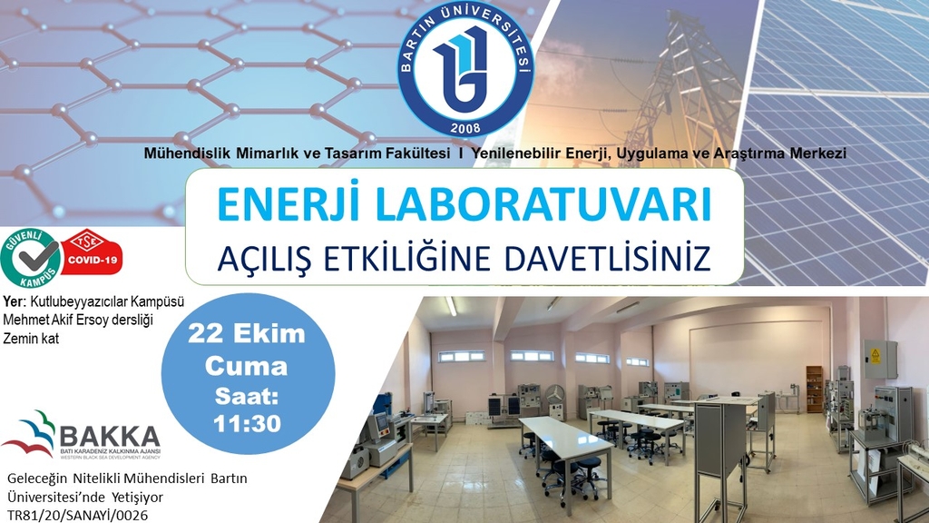 Üniversitemizin Batı Karadeniz Kalkınma Ajansı (BAKKA) tarafından desteklenmeye hak kazanan “Geleceğin Nitelikli Mühendisleri Bartın Üniversitesi’nde Yetişiyor” adlı projesi kapsamında Enerji Laboratuvarı Açılış Etkinliği düzenlenecektir. Etkinliğine Tüm Akademik Personel ve Öğrencilerimiz davetlidir.