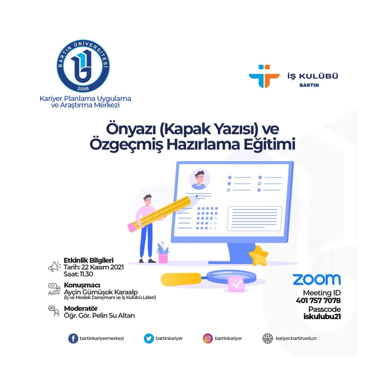 Önyazı (Kapak Yazısı) ve Özgeçmiş Hazırlama Tekniklerini konuşacağımız etkinliğe tüm öğrenci ve Mezunlarımız davetlidir.