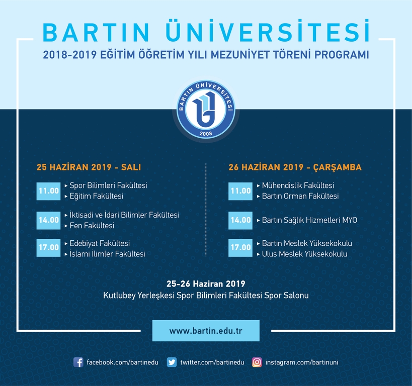 Bartın Üniversitesi ailesi olarak bugüne kadar aldığımız her kararda olduğu gibi “11. Mezuniyet Töreni” ile ilgili olarak da siz değerli öğrencilerimizin görüşlerine başvurduk. Bilindiği üzere üniversitemiz Üniversite Bilgi Yönetim Sistemi (ÜBYS) üzerinden yapılan anket ve daha sonra gerçekleştirilen toplantılarla, mezuniyet töreninin 24 Haziran-28 Haziran 2019 haftasında yapılması kararlaştırılmıştı.